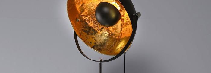 Massive Stehleuchte im angesagten Factory-Design. Die zwei gegenübergestellten Halbkugeln unterschiedlicher Größe spenden ein angenehm indirektes Licht, der goldige Innenanstrich des Schirmes sorgt für einen glänzenden Auftritt. Der drehbare Leuchtenschirm und die rollbare Basis machen die Dottore zu einem flexiblen Begleiter, der sich problemlos Ihren Bedürfnissen anpasst.